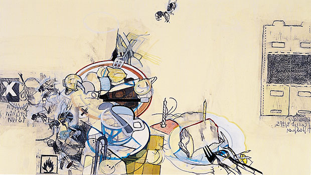 1999; Acryl, Bleistift, Collage und Fotokopie auf Papier; 47,5 x 83,5 cm.