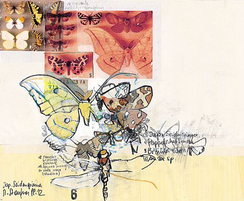 1999; Acryl, Bleistift, Ink Jet, Klebestreifen auf Papier; 34 x 41,5 cm.