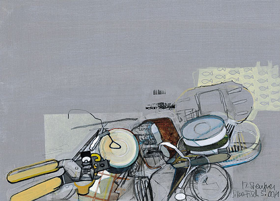 2000; Acryl, Farbstift, Bleistift, Collage und Fotokopie auf Papier; 41,5 x 58,5 cm.