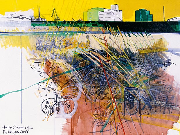 2004; Acryl, Bleistift, Farbstift und Collage auf Holz; 60 x 80 cm.