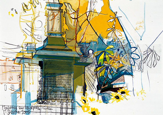 2005; Acryl, Bleistift, Farbstift und Collage auf Papier; 42 x 58 cm.