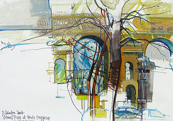 2007; Acryl, Bleistift, Farbstift, Collage auf Papier, 42 x 60 cm.