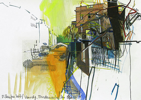 2007; Acryl, Bleistift, Farbstift, Collage auf Papier, 42 x 60 cm.