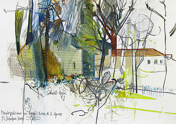 2007; Acryl, Bleistift, Farbstift, Collage auf Papier, 42 x 60 cm.