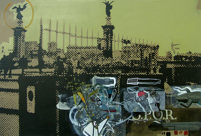 2007; Acryl, Bleistift, Farbstift, Collage auf Molino, 80 x 120 cm.
