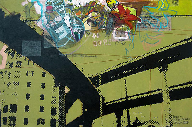 2007; Acryl, Bleistift, Farbstift, Collage auf Molino, 80 x 120 cm.