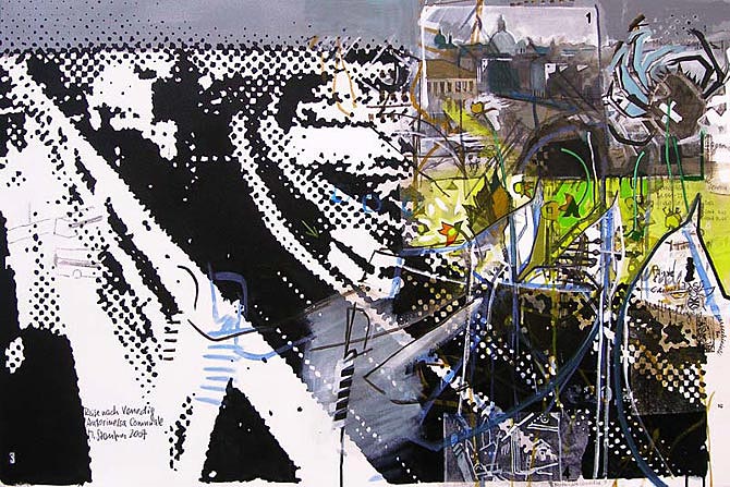 2007; Acryl, Bleistift, Farbstift, Collage auf Molino, 80 x 120 cm.