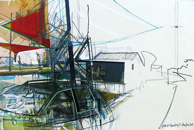 2007; Acryl, Bleistift, Farbstift, Collage auf Molino, 80 x 120 cm.
