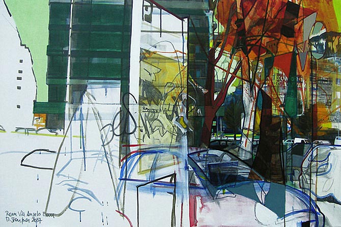 2007; Acryl, Bleistift, Farbstift, Collage, Fotokopie auf Molino, 80 x 120 cm.