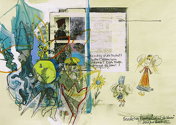 2007; Acryl, Bleistift, Farbstift, Collage, Fotokopie auf Papier, 42 x 60 cm.