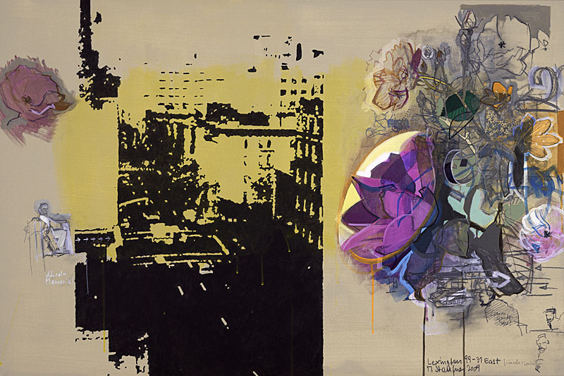 2009; Acryl, Bleistift, Farbstift, Collage auf Molino, 80 x 120 cm.