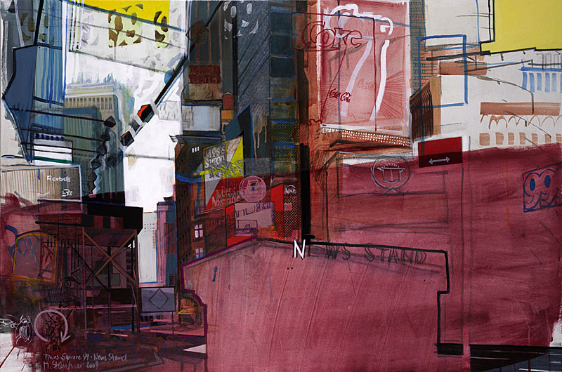 2009; Acryl, Bleistift, Farbstift, Collage auf Molino, 80 x 120 cm.
