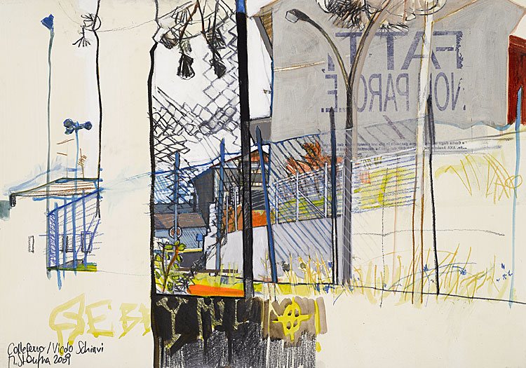 2009; Acryl, Bleistift, Farbstift, Collage auf Papier, 42 x 60 cm.