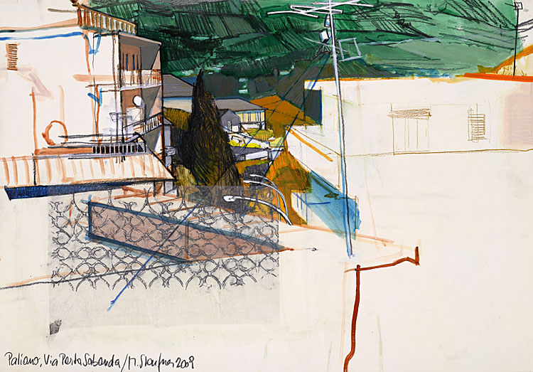 2009; Acryl, Bleistift, Farbstift, Collage auf Papier, 42 x 60 cm.