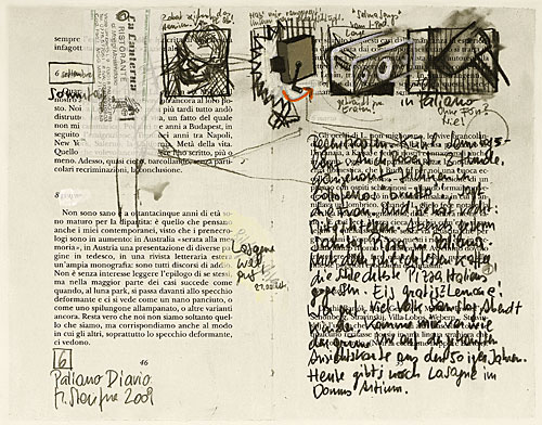2009; Acryl, Bleistift, Farbstift, Collage auf Papier/Buchseite, 22 x 27,5 cm.