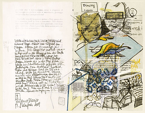 2009; Acryl, Bleistift, Farbstift, Collage auf Papier/Buchseite, 22 x 27,5 cm.