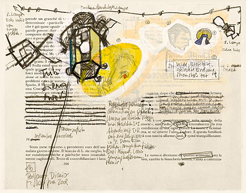 2009; Acryl, Bleistift, Farbstift auf Papier/Buchseite, 22 x 27,5 cm.