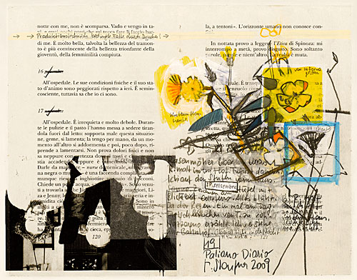 2009; Acryl, Bleistift, Farbstift, Collage, Ink Jet, Papier/Buchseite, 22 x 27,5 cm.