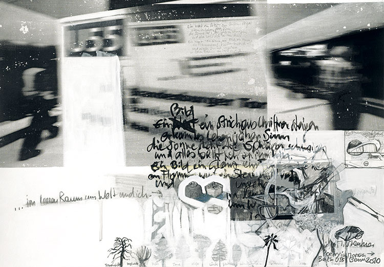 2010; Acryl, Bleistift, Farbstift, Fotokopie, Collage auf Papier, 42 x 60 cm.