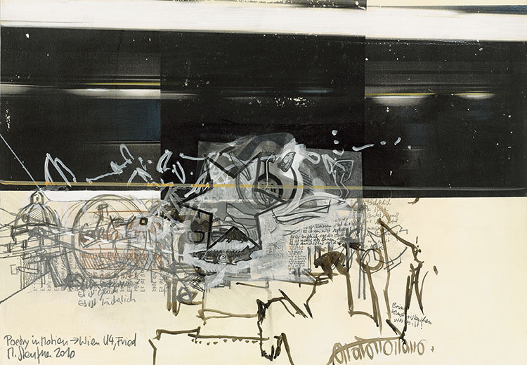 2010; Acryl, Bleistift, Farbstift, Fotokopie, Collage auf Papier, 42 x 60 cm.