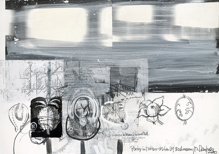 2010; Acryl, Bleistift, Farbstift, Fotokopie, Collage auf Papier, 42 x 60 cm.