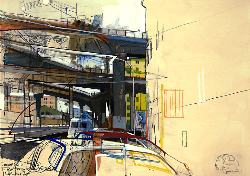 2009; Acryl, Bleistift, Farbstift, Collage auf Papier, 58 x 82 cm.