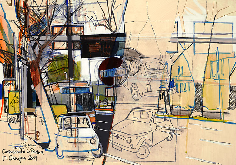 2009; Acryl, Bleistift, Farbstift, Collage auf Papier, 42 x 60 cm.