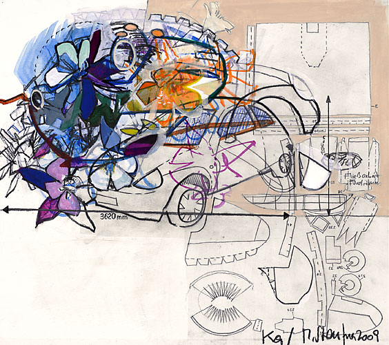 2009; Acryl, Bleistift, Farbstift, Collage auf Papier, 32 x 36 cm.