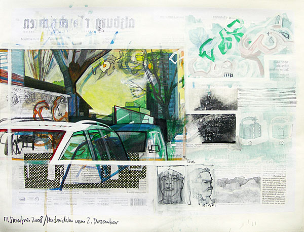 2008; Acryl, Bleistift, Farbstift, Fotokopie, Collage auf Papier, 50 x 65 cm.