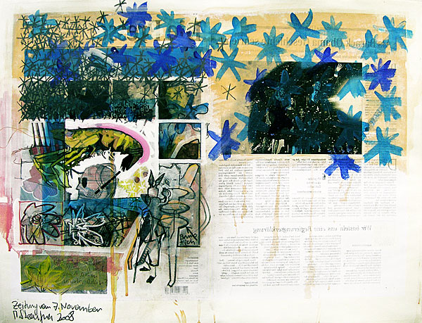2008; Acryl, Bleistift, Farbstift, Fotokopie, Collage auf Papier, 50 x 65 cm.