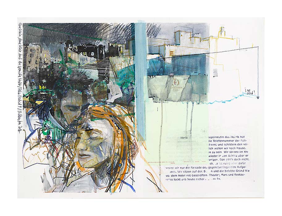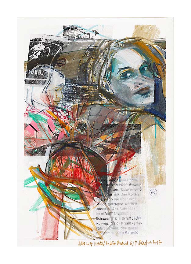Abb. 1, 2, 4, 5, 8, 9: Acryl, Farbstift, Collage; 60 x 41 cm.