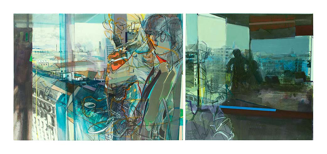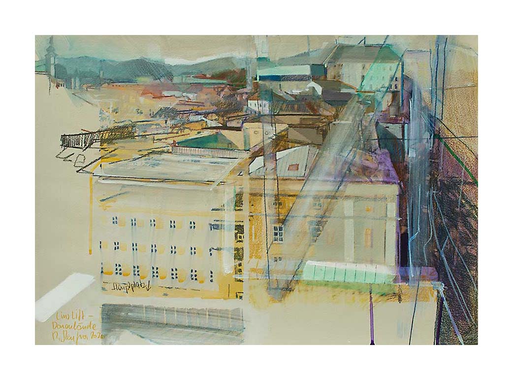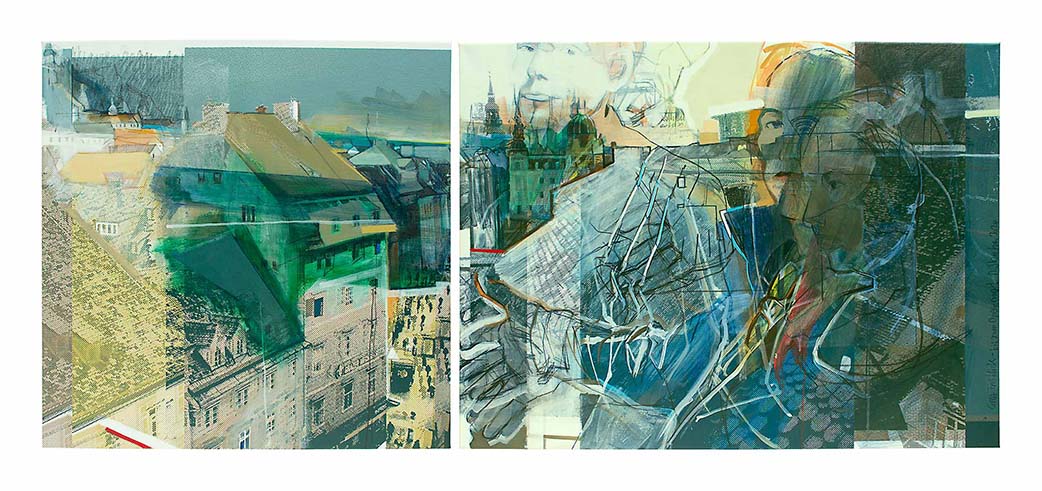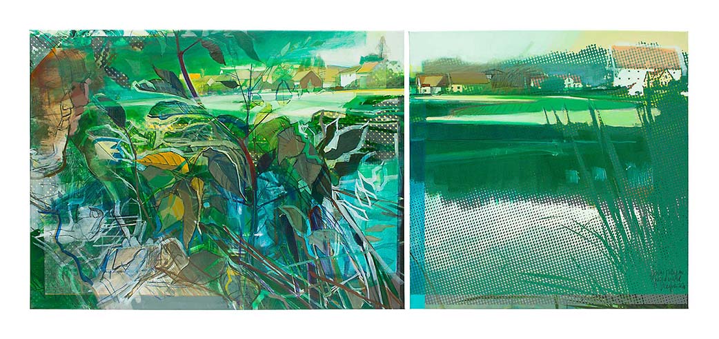 Panorama – 2020 Abb. 1 – 4: Acryl, Farbstift, Collage, Digitaldruck-Transfer, Digitaldruck, Leinwand;2-teilig zusammen 60 x 140 cm. Abb. 5 – 8: Acryl, Farbstift, Digitaldruck-Transfer, Digitaldruck, Aquarellkarton; 42 x 60 cm.